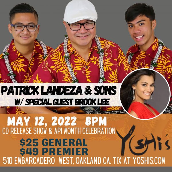 BERKELEY, CA (April 11, 2022) — Hot off the heels of his historic second Nā Hōkū Hanohano Award (Hawai‘i Academy of Recording Arts), Patrick Landeza returns to his musical roots, this time with his sons, for his latest self-titled Patrick Landeza & Sons CD. This special performance celebrates the release of his twelfth album and features Landeza senior on slack key guitar and vocals, his hānai son Justin Firmeza on Hawaiian steel guitar, and Patrick Landeza, Jr. (PJ) on bass guitar. In addition, special guest, former Miss Universe and media personality Brook Mahealani Lee, the only Native Hawaiian to capture the Miss Universe crown, will take on MC duties and showcase her hula dance skills.